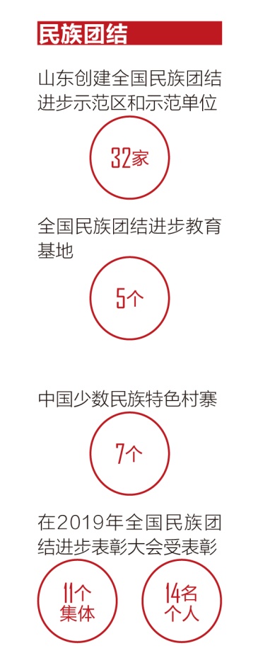 在全國率先啟動(dòng)民族團(tuán)結(jié)進(jìn)步和美家庭、示范崗位評選工作,營造爭先創(chuàng)優(yōu)氛圍。連續(xù)21年開展民族團(tuán)結(jié)進(jìn)步宣傳月活動(dòng),成為民族團(tuán)結(jié)進(jìn)步宣傳教育的特色品牌。實(shí)施城市民族工作“十有”示范社區(qū)建設(shè),開展城市民族工作“紅石榴”品牌創(chuàng)建活動(dòng),青島市、煙臺(tái)市、濟(jì)南市歷下區(qū)先后被國家民委確定為全國少數(shù)民族流動(dòng)人口服務(wù)管理示范城市。截至目前,山東創(chuàng)建全國民族團(tuán)結(jié)進(jìn)步示范區(qū)和示范單位32家、全國民族團(tuán)結(jié)進(jìn)步教育基地5個(gè)、中國少數(shù)民族特色村寨7個(gè),在2019年全國民族團(tuán)結(jié)進(jìn)步表彰大會(huì)上有11個(gè)集體和14名個(gè)人受到表彰。