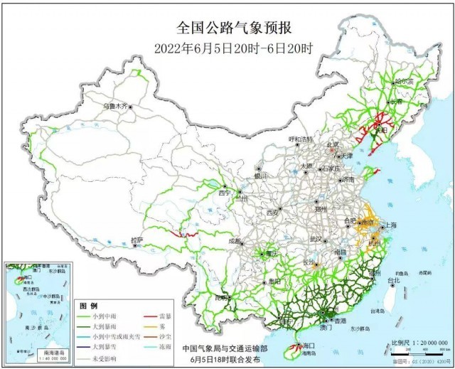 6月5日20時(shí)至6日20時(shí),湖南南部、江西南部、浙江南部、福建大部、廣西南部和東部、廣東大部及云南中部、遼寧中部等地部分地區(qū)有大到暴雨,其中,湖南南部、廣西東北部、廣東西北部、福建西部等地部分地區(qū)有大暴雨。遼寧大部、山東東部、海南北部、西藏東北部等地局地有雷暴。另外,江蘇中南部、浙江中北部、安徽東部、湖南東部等地局地有霧。