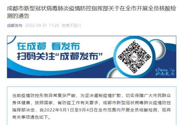 央視網(wǎng)消息:9月1日,成都市新型冠狀病毒肺炎疫情防控指揮部發(fā)布《關于在全市開展全員核酸檢測的通告》。