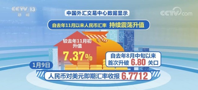 從去年底到今年開(kāi)年至今,人民幣匯率走出了一波反彈回升行情。中國(guó)外匯交易中心數(shù)據(jù)顯示,自去年11月以來(lái)人民幣匯率持續(xù)震蕩升值。1月9日人民幣對(duì)美元即期匯率收?qǐng)?bào)6.7712,較去年11月初升值7.37%,也是自去年8月中旬以來(lái)首次升破6.80關(guān)口。