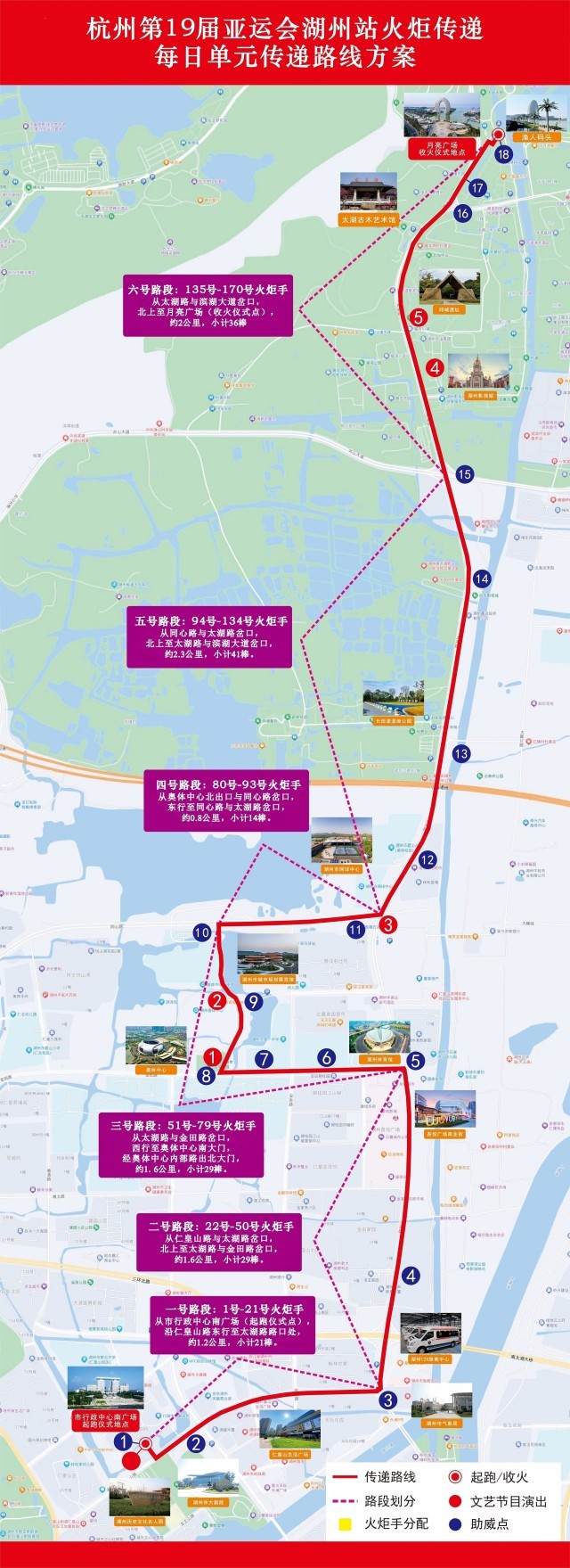 本次傳遞以“在湖州看見美麗中國”為主題,傳遞路線從湖州市行政中心南廣場出發(fā),沿仁皇山路—太湖路—金田路—奧體中心—同心路—太湖路進行傳遞,最后到達南太湖月亮廣場,舉行收火儀式。