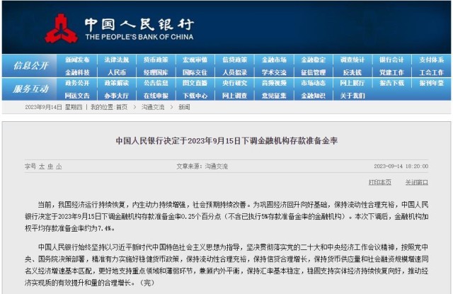 央行決定9月15日下調(diào)金融機(jī)構(gòu)存款準(zhǔn)備金率0.25個(gè)百分點(diǎn)