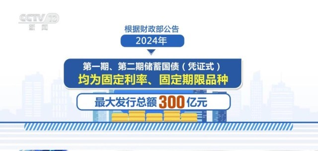 根據(jù)財政部公告,2024年第一期、第二期儲蓄國債(憑證式)均為固定利率、固定期限品種,最大發(fā)行總額300億元。其中,第一期期限為3年,最大發(fā)行額150億元,票面年利率2.38%;第二期期限為5年,最大發(fā)行額150億元,票面年利率2.5%。