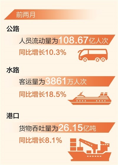 貨運量穩(wěn)步增長。前兩月,我國公路貨運量達到54.54億噸,同比增長7.8%;水路貨運量近14億噸,同比增長10.2%。
