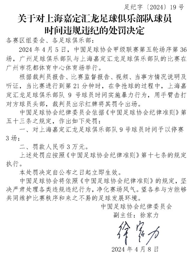 央視網(wǎng)消息:4月10日,中國足協(xié)網(wǎng)站發(fā)布《關(guān)于對上海嘉定匯龍足球俱樂部隊(duì)球員時(shí)間違規(guī)違紀(jì)的處罰決定》《關(guān)于對西安崇德榮海足球俱樂部隊(duì)違規(guī)違紀(jì)的處罰決定》《關(guān)于對大連鯤城足球俱樂部隊(duì)違規(guī)違紀(jì)的處罰決定》三份處罰決定。中甲聯(lián)賽上海嘉定匯龍9號球員因暴力行為被停賽罰款。中乙聯(lián)賽大連鯤城與西安崇德榮海兩家俱樂部因未按規(guī)定指派特定官員參加賽前聯(lián)席會(huì),被通報(bào)批評。
