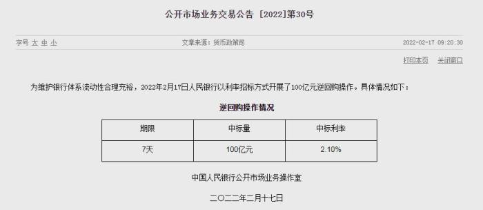 中新財(cái)經(jīng)2月17日電 17日,據(jù)中國(guó)人民銀行官網(wǎng)消息,為維護(hù)銀行體系流動(dòng)性合理充裕,2022年2月17日人民銀行以利率招標(biāo)方式開(kāi)展了100億元逆回購(gòu)操作,期限為7天,中標(biāo)利率為2.10%。(完)