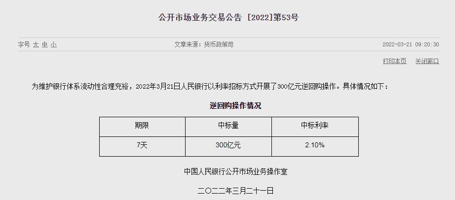 中新財經(jīng)3月21日電 3月21日,為維護銀行體系流動性合理充裕,人民銀行以利率招標方式開展了300億元7天期逆回購操作,中標利率為2.10%。(完)