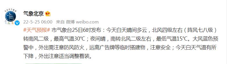 中新網(wǎng)5月25日電 據(jù)北京市氣象局官方微博消息,北京市氣象臺(tái)25日6時(shí)發(fā)布:今天白天晴間多云,北風(fēng)四級(jí)左右(陣風(fēng)七八級(jí))轉(zhuǎn)南風(fēng)二級(jí),最高氣溫30℃;夜間晴,南轉(zhuǎn)北風(fēng)二級(jí)左右,最低氣溫15℃。大風(fēng)藍(lán)色預(yù)警中,外出需注意防風(fēng)防火,遠(yuǎn)離廣告牌等臨時(shí)搭建物,注意安全;今天白天氣溫有所下降,外出注意適當(dāng)調(diào)整著裝。