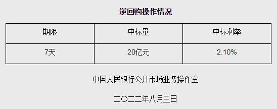 央行8月3日開展20億元逆回購操作 中標利率2.10%