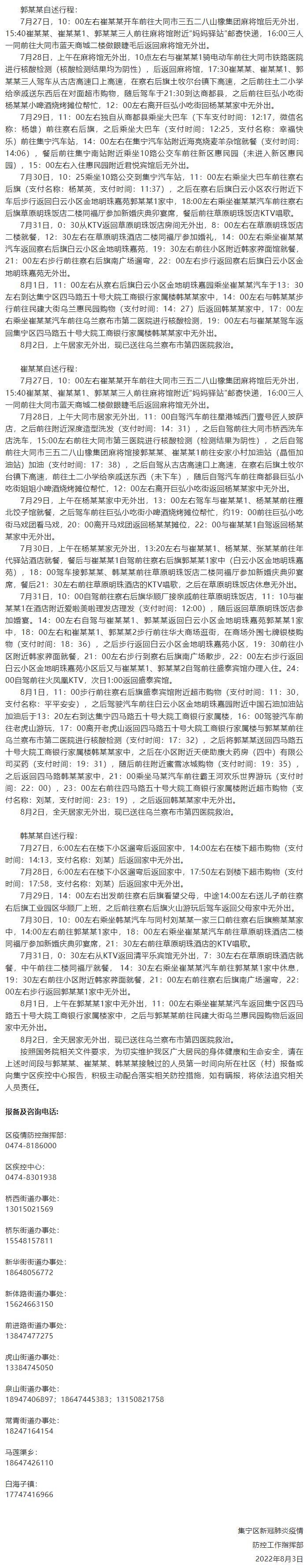 2022年8月2日,內(nèi)蒙古烏蘭察布市集寧區(qū)在居民“愿檢盡檢”中發(fā)現(xiàn)一管混檢異常樣本,隨即對所有混檢人員進(jìn)行單采單檢,其中大同市前來集寧區(qū)人員郭某某為初篩陽性,同時對郭某某同行同住人員進(jìn)行核酸檢測,同行同住人員崔某某、韓某某為初篩陽性,目前此3例初篩陽性人員均已轉(zhuǎn)運至定點救治醫(yī)院,現(xiàn)將3人的行程軌跡公布如下: