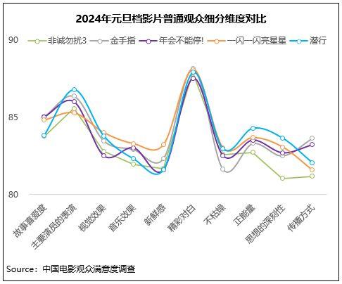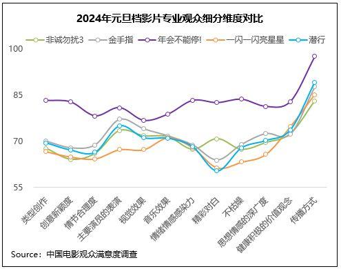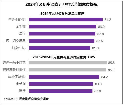 中國電影觀眾滿意度調(diào)查 2024年元旦檔調(diào)查結(jié)果顯示,元旦檔電影觀眾滿意度得分83.0分,環(huán)比增長0.2分。檔期以多元化且高契合度的影片供給陪伴觀眾跨年,得到了較高的滿意度評價,5部影片中有4部進(jìn)入歷史調(diào)查19部元旦檔影片的滿意度前十,喜劇《年會不能停!》以84.2分領(lǐng)銜,《金手指》83.0分居第二位,《潛行》《一閃一閃亮星星》均超82分,《非誠勿擾3》超81分。