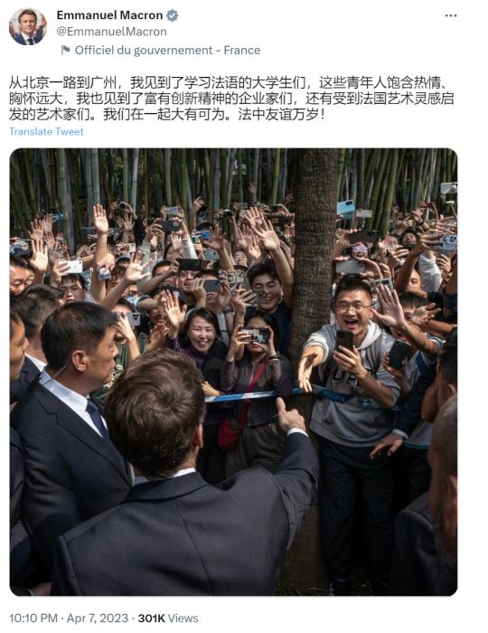 馬克龍寫道,“從北京一路到廣州,我見到了學(xué)習(xí)法語的大學(xué)生們,這些青年人飽含熱情、胸懷遠(yuǎn)大,我也見到了富有創(chuàng)新精神的企業(yè)家們,還有受到法國藝術(shù)靈感啟發(fā)的藝術(shù)家們。我們在一起大有可為。法中友誼萬歲!”