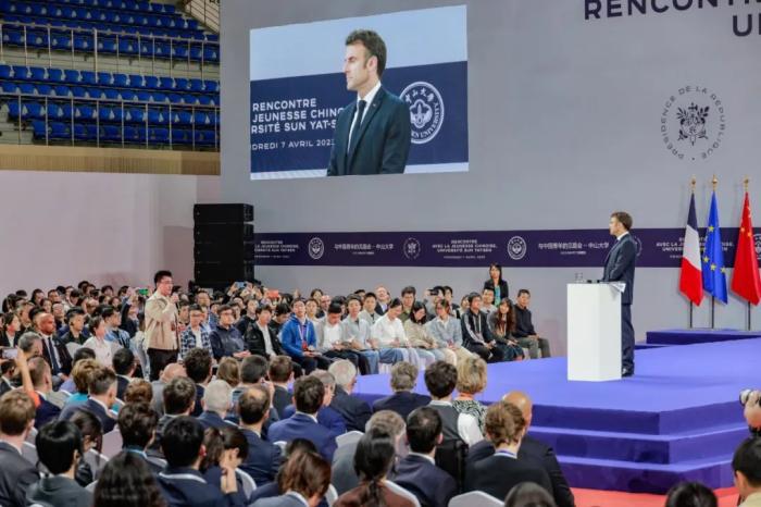 在中山大學(xué)南校園體育館,馬克龍舉行與中國青年的見面會,作了簡短演講并回答學(xué)生提問。