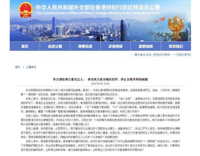 中新網(wǎng)8月3日電 據(jù)外交部駐港公署網(wǎng)站消息,針對英國政府發(fā)布更新2023年《海外經(jīng)營風險指南:香港》,污名化香港國安法和新選舉制度,無理詆毀香港民主、自由、人權(quán)狀況,肆意抹黑“一國兩制”成功實踐,粗暴干預香港事務和中國內(nèi)政,外交部駐港公署表示強烈譴責和堅決反對。