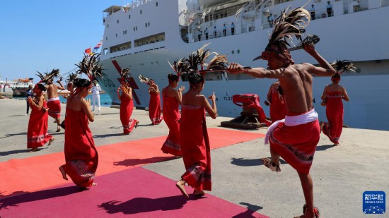 上午10時(shí)許,東帝汶政府在碼頭舉行了隆重的歡迎儀式,總統(tǒng)奧爾塔前來(lái)碼頭迎接并發(fā)表致辭。東國(guó)防軍司令法魯爾中將,中國(guó)駐東帝汶大使館、中資機(jī)構(gòu)、中國(guó)援東醫(yī)療隊(duì)、華僑華人等300余人在碼頭迎接。當(dāng)?shù)孛癖娤蛑蟹街笓]員獻(xiàn)上圍巾,身著民族特色服飾的東舞蹈隊(duì)員載歌載舞,華僑華人進(jìn)行了舞龍舞獅表演。