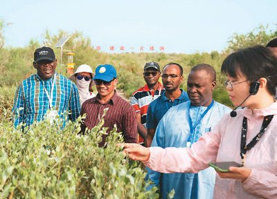 近日,來自非洲的專家在中國新疆參加中非治沙培訓班。圖為在塔克拉瑪干沙漠腹地塔中植物園,中方技術(shù)人員向非洲學員介紹荒漠植物。