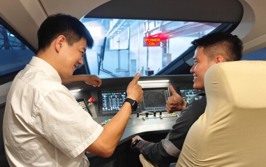 8月25日,在印度尼西亞萬(wàn)隆的雅萬(wàn)高鐵德卡魯爾動(dòng)車所內(nèi),中國(guó)師傅穆振(左)在向印尼火車司機(jī)塞蒂亞萬(wàn)講解動(dòng)車組出庫(kù)前的上電作業(yè)。