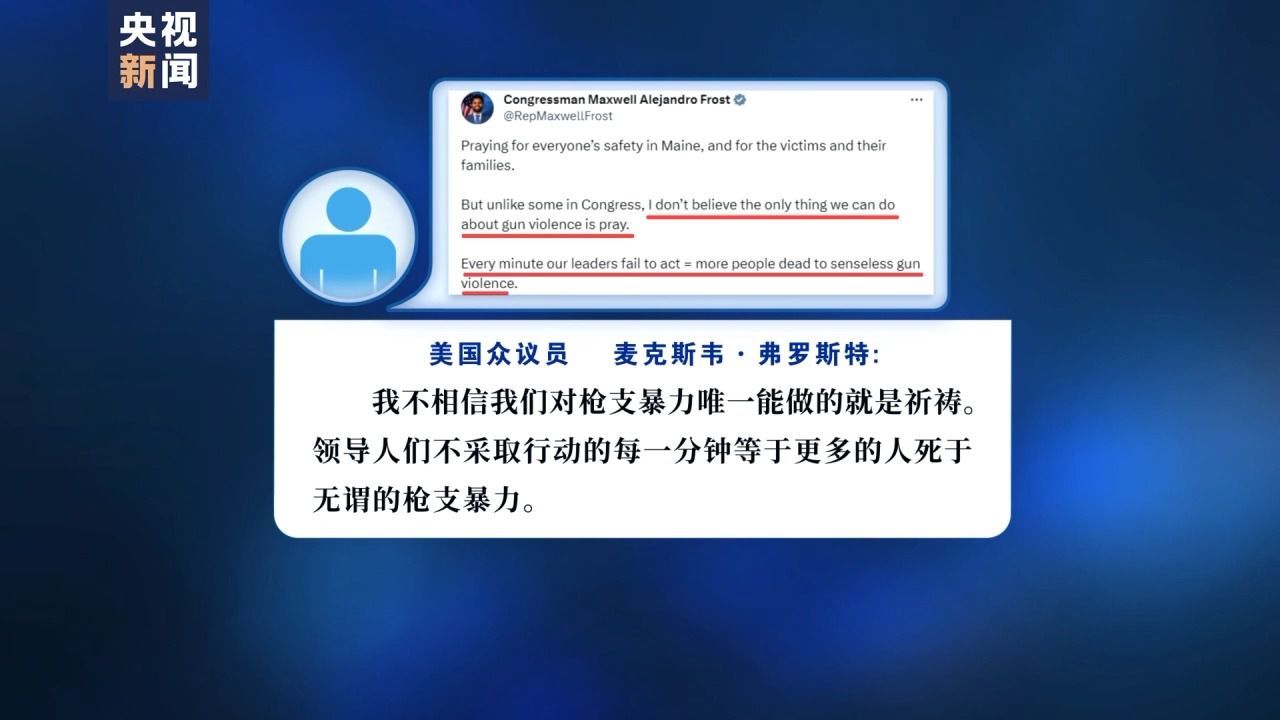 美國(guó)全國(guó)廣播公司主持人 琳賽·賴澤:許多控槍派人士將此次大規(guī)模槍擊案的發(fā)生歸結(jié)于緬因州控槍立法不力。他們呼吁頒布突擊步槍禁令,并對(duì)所有槍支銷售進(jìn)行背景審查。