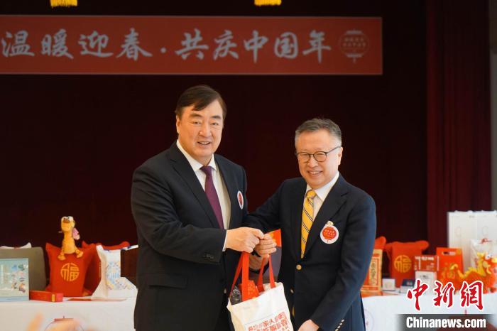 圖為中國(guó)駐韓國(guó)大使邢海明(左)向與會(huì)代表發(fā)放春節(jié)包。金琳 攝