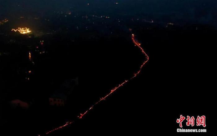 400余條板凳燈連接而成的近800米長的梅燭龍燈繞村游走,夜色中猶如一條巨龍。陳斌 攝