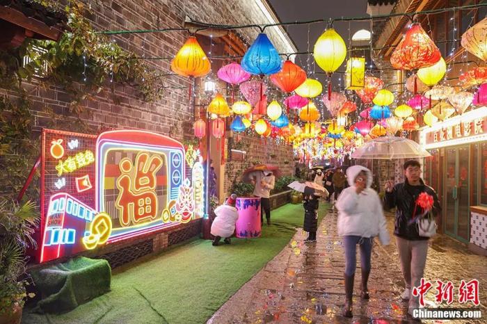 江西南昌萬壽宮歷史文化街區(qū),市民從掛滿花燈的小巷內(nèi)走過。劉力鑫 攝