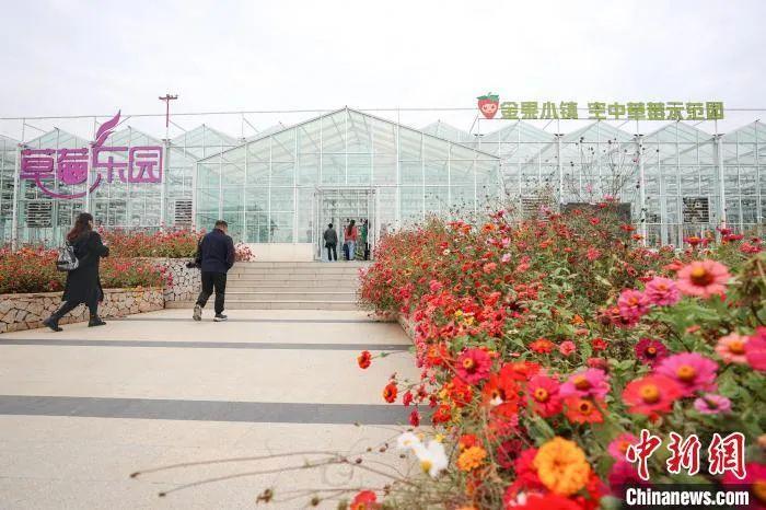 圖為南昌安義縣喬樂鄉(xiāng)的金果小鎮(zhèn)空中草莓示范園,游客走進園內(nèi)參觀。劉力鑫 攝