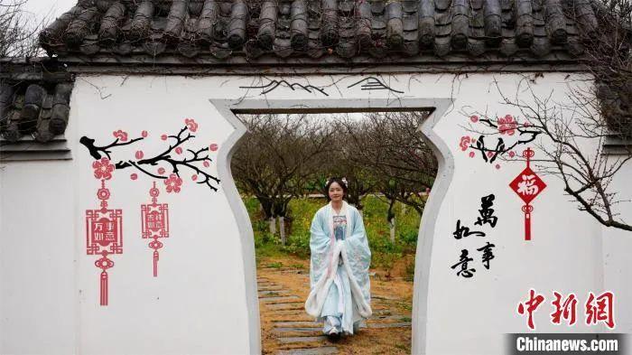 圖為江西南昌縣鳳凰溝梅園內(nèi)身著漢服的游客正在游園。巫發(fā)陽 攝