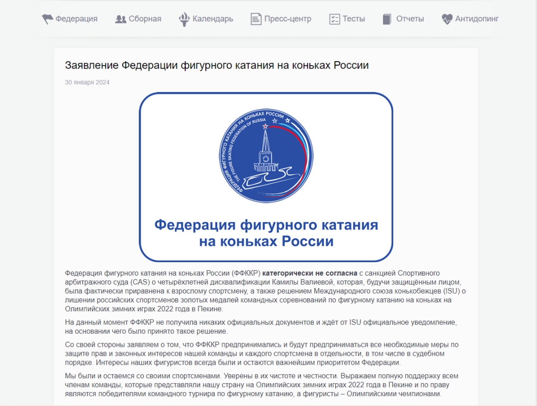 當(dāng)?shù)貢r(shí)間1月30日,俄羅斯花樣滑冰聯(lián)合會(huì)(FFKKR)發(fā)布聲明表示,團(tuán)隊(duì)中運(yùn)動(dòng)員的誠(chéng)信無(wú)可挑剔,“堅(jiān)決不同意國(guó)際體育仲裁法庭對(duì)卡米拉·瓦利耶娃的處罰”。