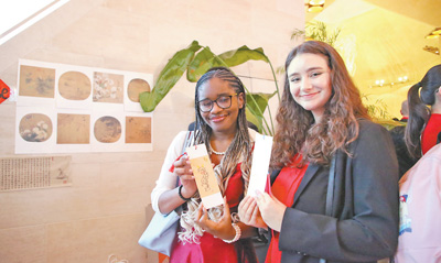 圖為在文化體驗展臺,兩名美國學(xué)生展示自己用毛筆繪制的書簽。