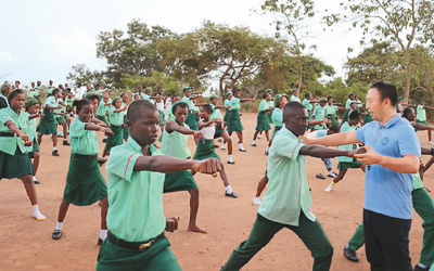2月的塞拉利昂,驕陽(yáng)似火。在首都弗里敦一所中學(xué)里,“中國(guó)師父”劉偉正為近百名學(xué)生表演五步拳。他眼神堅(jiān)毅,動(dòng)作行云流水,揮汗如雨卻酣暢淋漓,贏得陣陣掌聲。