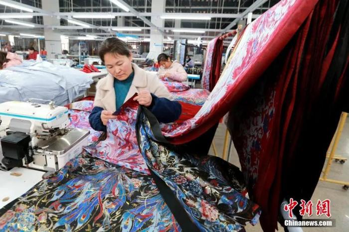 工人將剪裁好的布料進行拼接縫制。梁犇 攝