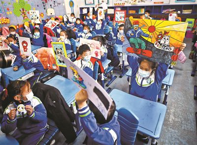 昨天是本市中小學(xué)生春季學(xué)期開學(xué)首日,各校的開學(xué)第一課紛紛以傳播“冬奧精神”為主打,將冬奧融入“大思政課”。圖為昨天,中科院附屬玉泉小學(xué),同學(xué)們展示自己在寒假里創(chuàng)作的以冬奧、“冰墩墩”為主題的藝術(shù)作品。攝影/本報(bào)記者 郝羿