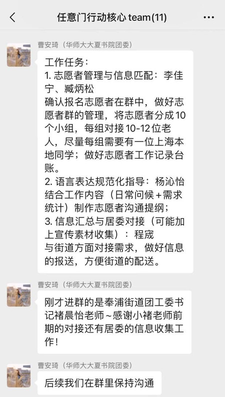 項(xiàng)目啟動(dòng)當(dāng)晚,合作雙方即建立行動(dòng)核心team微信群,大夏書(shū)院志愿者總隊(duì)和小區(qū)在地志愿者小分隊(duì)也同步建立子微信群,統(tǒng)一行動(dòng)指南,明確責(zé)任分工,過(guò)濾重復(fù)信息,提高老年人緊急需求的處置效率。