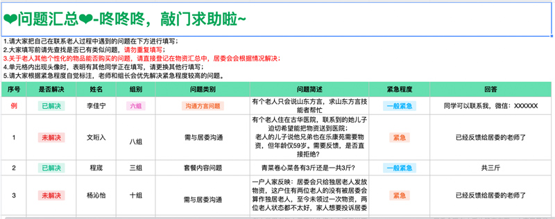 在溝通過(guò)程中,志愿者時(shí)常遇到語(yǔ)言不通、交流不暢等問(wèn)題,他們用耐心努力克服困難。2020級(jí)翻譯專(zhuān)業(yè)的方可昕在溝通過(guò)程中收到了丁女士的求助,她的奶奶98歲高齡,獨(dú)居家中,因?yàn)槔先艘暳?、?tīng)力都有障礙,也不會(huì)使用電子設(shè)備,家人非常擔(dān)心……丁女士聲音哽咽,方可昕感到揪心。她一邊安撫丁女士,記錄需求,并在文檔中標(biāo)注為“非常緊急”。情況提供到“核心team”微信群后,小區(qū)在地志愿者陳天瑋立即趕往現(xiàn)場(chǎng),大約十分鐘就收到了反饋:老人安全無(wú)恙。為了更加詳細(xì)了解老人的情況,方可昕與丁女士共通了9次電話(huà)。