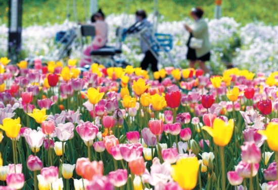 昨天,三三兩兩的游人漫步在世界花卉大觀園的郁金香花海中,感受暮春時(shí)節(jié)的色彩斑斕。園內(nèi)37種近20萬株郁金香,正在陸續(xù)開放。世界花卉大觀園還將舉辦首屆郁金香插花花藝大賽,貼近市民家庭園藝需求。 本報(bào)記者 劉平攝