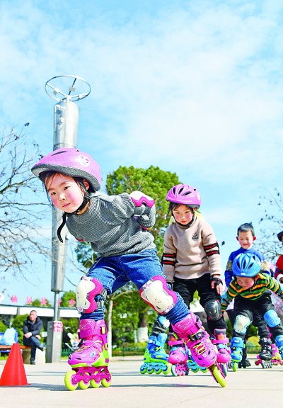 浙江省臺州市仙居縣一公園,小朋友在學(xué)習(xí)輪滑。王華斌攝/光明圖片