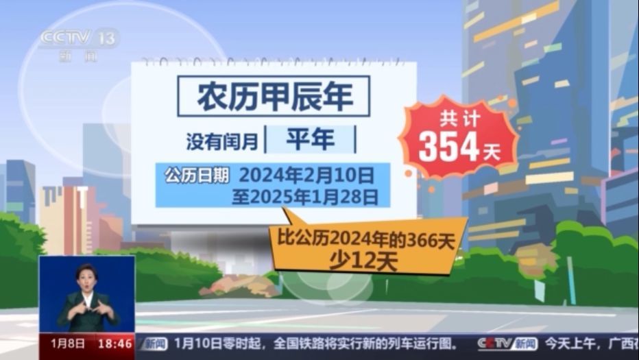 即將到來的農(nóng)歷甲辰年沒有閏月,因此是一個平年,其對應(yīng)的公歷日期為2024年2月10日至2025年1月28日,共計354天。所以比公歷2024年的366天少了12天。
