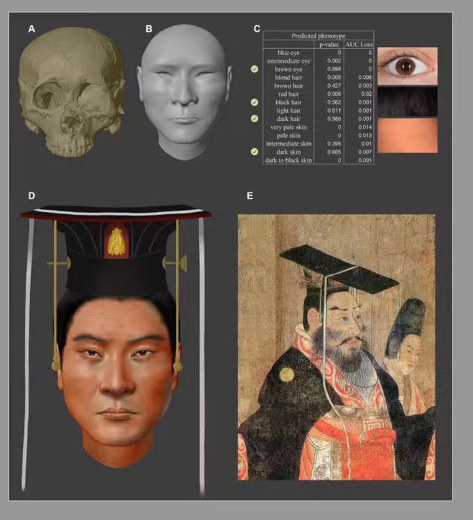 復(fù)旦大學(xué)科技考古研究院文少卿團(tuán)隊(duì)用專門適用于古DNA的捕獲探針,從北周武帝肢骨樣本上獲取了約100萬個(gè)可用的基因位點(diǎn),還原北周武帝頭發(fā)、皮膚、瞳孔等關(guān)鍵特征。經(jīng)過6年的反復(fù)嘗試,終于“描繪”出宇文邕頭像。