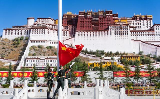 10月1日,拉薩市布達(dá)拉宮廣場(chǎng)舉行升國(guó)旗儀式。 新華社記者 丁增尼達(dá) 攝