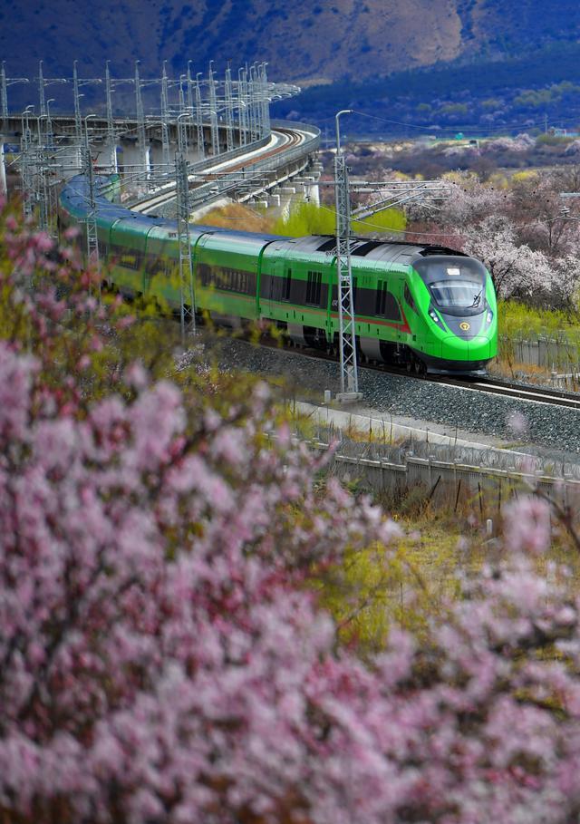 2023年3月21日,復(fù)興號(hào)列車(chē)穿行在西藏拉林鐵路林芝段的桃花間。新華社記者 覺(jué)果 攝