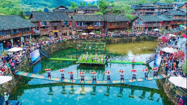 廣西投入中央財(cái)政少數(shù)民族發(fā)展資金1.6億元,打造民族村寨與鄉(xiāng)村旅游融合發(fā)展試點(diǎn)39個(gè)。圖為2024年4月廣西傳統(tǒng)民族節(jié)日“三月三”期間,來(lái)自全國(guó)的游客與夢(mèng)嗚苗寨村民一起慶祝節(jié)日。廣西壯族自治區(qū)柳州市民宗委供圖