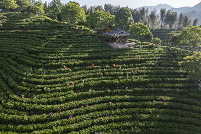 浙江省景寧畬族自治縣以國(guó)家民委“共同現(xiàn)代化試點(diǎn)”為抓手,積極促進(jìn)農(nóng)文旅融合發(fā)展。圖為2021年4月30日,參賽隊(duì)員在景寧縣澄照鄉(xiāng)三石村惠明茶園參加采茶比賽(無(wú)人機(jī)照片)。新華社發(fā)(李肅人 攝)