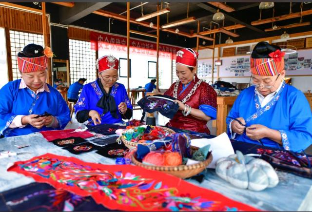 貴州省級(jí)非遺苗繡代表性傳承人龍祿穎創(chuàng)辦了非遺文化企業(yè),帶領(lǐng)各族群眾就業(yè)增收。圖為龍祿穎(右二)和公司員工們?cè)谑止ご汤C車(chē)間刺繡。新華社記者 楊文斌 攝