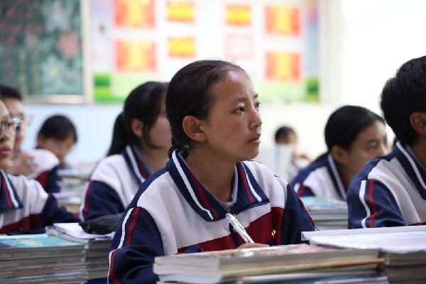 果洛西寧民族中學(xué)學(xué)生尼東拉毛在上課(圖片來(lái)源:新華社)