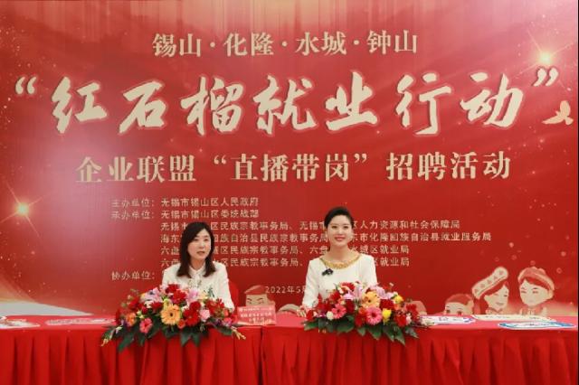 江蘇深入實(shí)施“紅石榴”就業(yè)行動(dòng)。截至今年7月,全省13個(gè)設(shè)區(qū)市的410家企業(yè)累計(jì)面向民族地區(qū)各族群眾提供3.45萬(wàn)個(gè)就業(yè)崗位。圖為江蘇省無(wú)錫市錫山區(qū)與貴州省六盤(pán)水市水城區(qū)、鐘山區(qū),青海省海東市化隆回族自治縣通過(guò)網(wǎng)絡(luò)平臺(tái)舉行“紅石榴就業(yè)行動(dòng)”合作簽約暨企業(yè)聯(lián)盟“直播帶崗”招聘活動(dòng)。江蘇省民族宗教事務(wù)委員會(huì)供圖