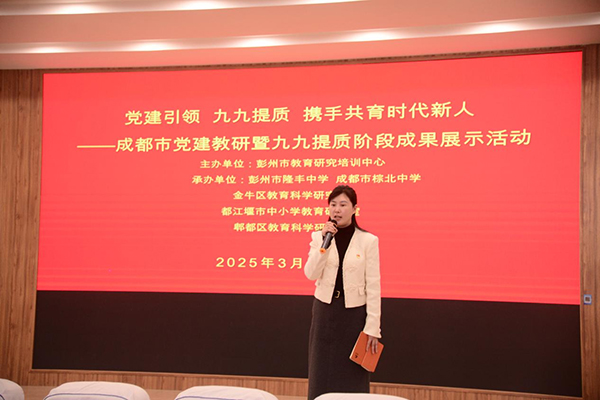 陽(yáng)春三月,齊聚彭州共教研。為全面貫徹落實(shí)黨的二十屆三中全會(huì)和全國(guó)教育大會(huì)精神,系統(tǒng)推進(jìn)黨的教育方針和黨中央決策部署在中小學(xué)得到貫徹落實(shí),堅(jiān)持“為黨育人、為國(guó)育才”。3月25日下午,彭州市隆豐中學(xué)開(kāi)展成都市黨建教研暨“九九提質(zhì)”階段成果展示活動(dòng)。