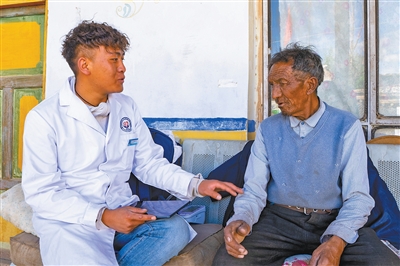 89歲的南加是村里最年長的老人,也是索朗丹增牽掛的對象。每個月,他都會拿起“智能書包”和平板電腦,上門為老人提供健康服務(wù)。包里裝著血壓計等,平板電腦里有老人的健康資料。