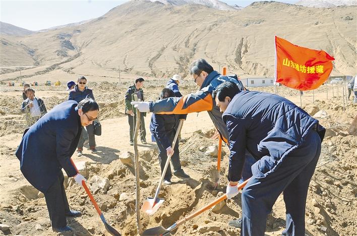 2012年,由山東省濰坊市第六批援藏工作隊(duì)具體負(fù)責(zé)的“湘河谷”經(jīng)濟(jì)林生態(tài)產(chǎn)業(yè)扶貧項(xiàng)目在南木林縣實(shí)施。項(xiàng)目集旅游觀光、苗木生產(chǎn)、林產(chǎn)品深加工、果品銷售于一體,總投資20億元,規(guī)劃面積10萬畝。最終形成地方政府、當(dāng)?shù)厝罕?、企業(yè)共同受益的“全贏”局面。 圖為山東省濰坊市援藏干部正在栽植經(jīng)濟(jì)林木(2012年3月12日攝)。 (本版圖片均為資料圖片)