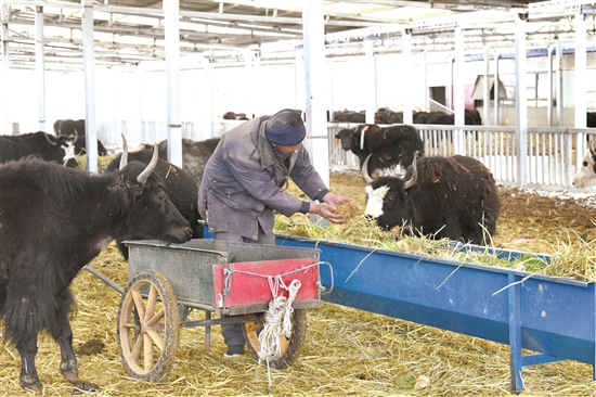 為當雄縣凈土牧場郭慶廠員工正在給牦牛喂飼料。
