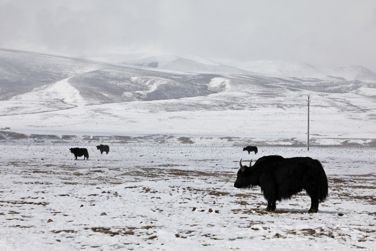 時(shí)已暮春,但在高寒牧區(qū)天然草場(chǎng),草還沒(méi)發(fā)芽,洛絨赤乃只好讓牛在雪地里啃冬天留下的枯草。雖然定居點(diǎn)牛棚里有儲(chǔ)存的人工飼草,但還是要備不時(shí)之需,因?yàn)榇合闹贿€會(huì)經(jīng)常下雪,也是牦牛最難熬的時(shí)節(jié)。